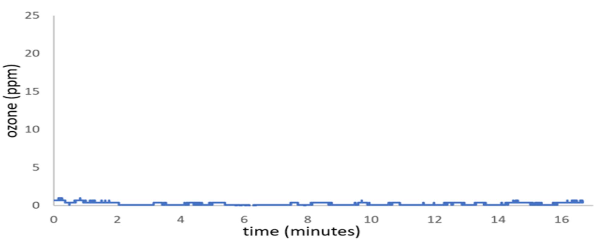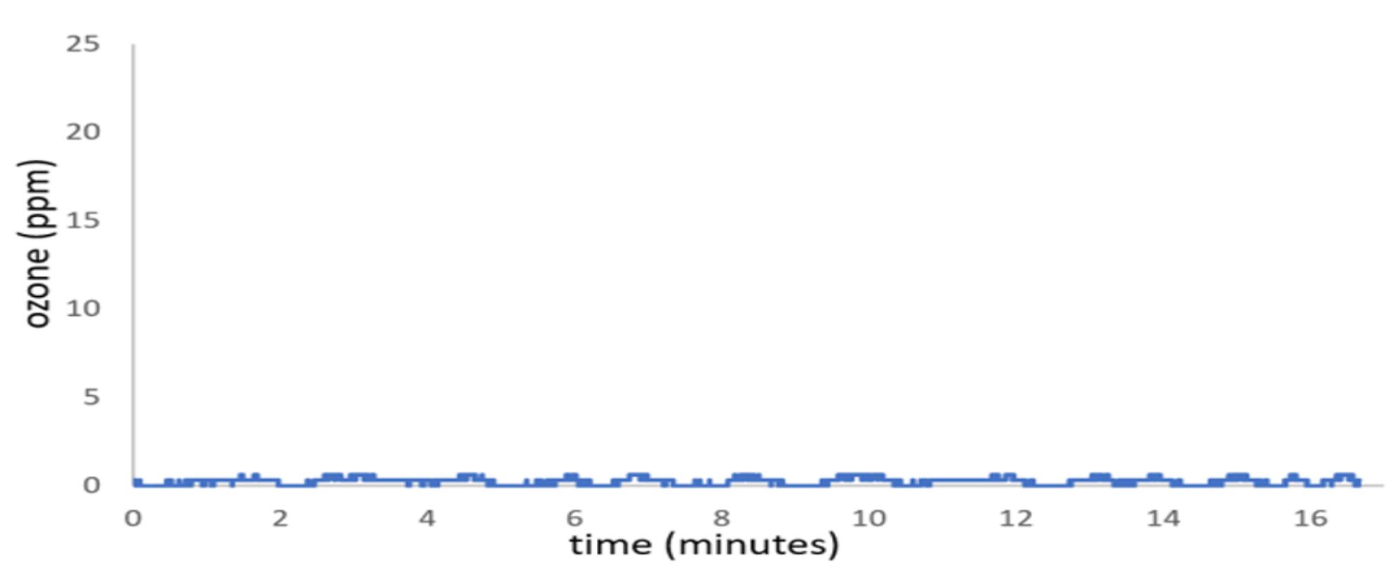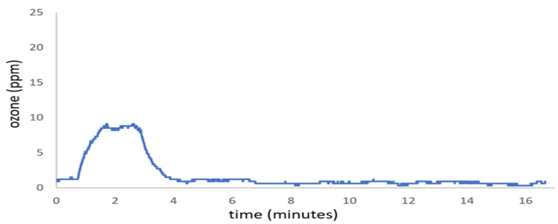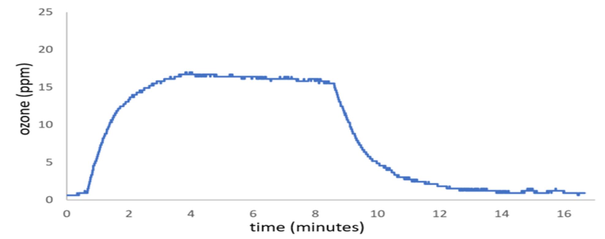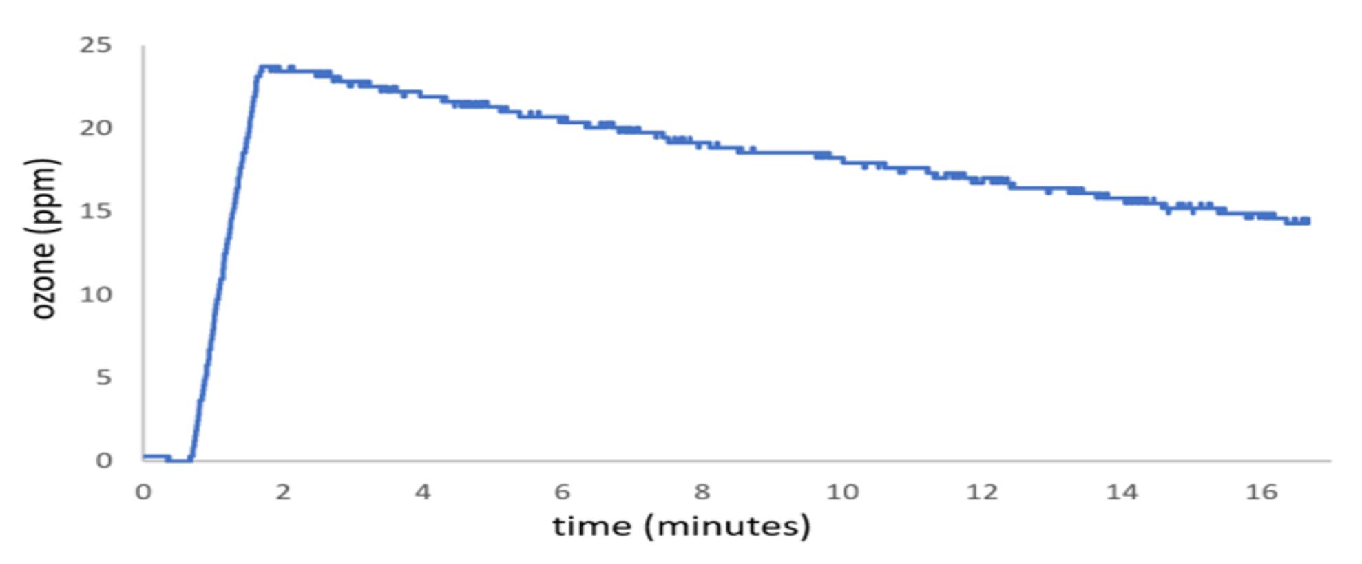 圖1.在一個24L 儲物盒中,在充滿和衰減期間,臭氧濃度隨時間變化的過程,蓋緊蓋子,并使用指定的臭氧鼓泡器產(chǎn)生600 mg / hr的臭氧。打開發(fā)生器電源后,臭氧濃度立即開始上升,并線性上升至大約24 ppm的水平,此時關閉了臭氧發(fā)生器電源,并使臭氧濃度下降。請注意,該盒子是空的,除了臭氧傳感器和一個混合風扇陣列已經(jīng)經(jīng)過大約10個臭氧充電周期。
