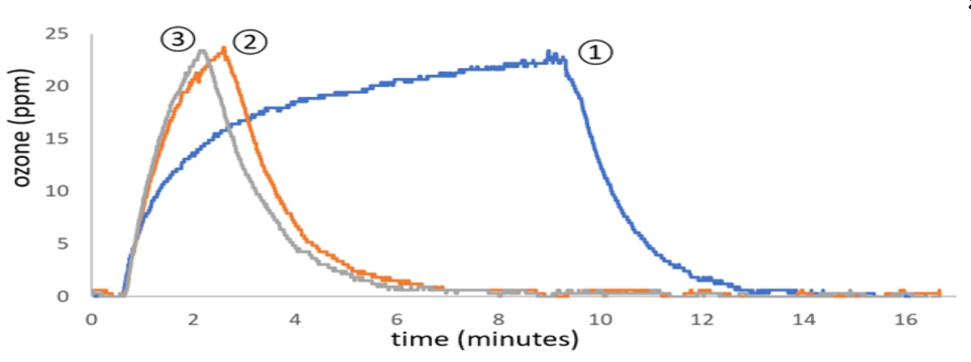 圖4.在盒子里裝臭氧淬火材料的影響。這將模擬一個使用骯臟和多孔材料的實際去污循環(huán),也演示了“壁效應”,它減少臭氧的半衰期,因為它與表面(壁)接觸。臭氧盒裝220mm x 80mm x 160mm小紙板箱2個,總面積約為1300平方厘米,用過丁腈手套1副,用過N95口罩1副。將蓋子緊密貼合,使用指定為每小時產(chǎn)生600mg臭氧的臭氧鼓泡器進行凈化循環(huán)。第一次臭氧濃度充滿和衰變循環(huán)如圖所示(1)。第一次去污循環(huán)耗時近10分鐘,達到 很大臭氧濃度20ppm以上。去污箱蓋被移開,剩余的臭氧被吹出。蓋被換掉,緊接著是第二次(2),然后是第三次(3)凈化循環(huán)。這些項目沒有被移除,每個循環(huán)緊接在前一個循環(huán)之后。注意,臭氧充電時間減少與每個循環(huán)。這一結(jié)果清楚地表明,骯臟的、受污染的和表面積大的材料 很初將對臭氧產(chǎn)生強大的猝滅作用。在第一次去污后,臭氧的猝滅作用大大降低,在隨后的去污循環(huán)中減少的程度要小得多。教訓:當去污染的東西,或者很多東西的時候,去污染的時間要長,讓臭氧運行的時間也要長,而且要考慮去污染不止一個周期。
